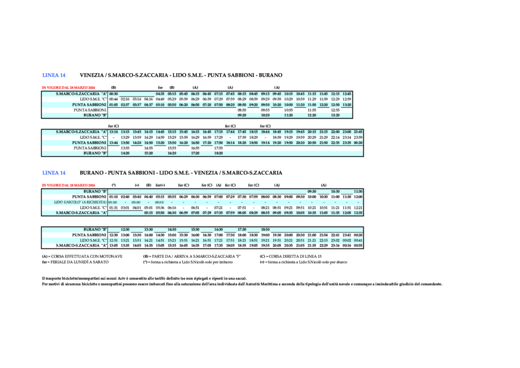 - 3.17 Linie 14 – VENEZIA/S. ZACCARIA – LIDO S.M.E. – PUNTA SABBIONI – (BURANO) und zurück