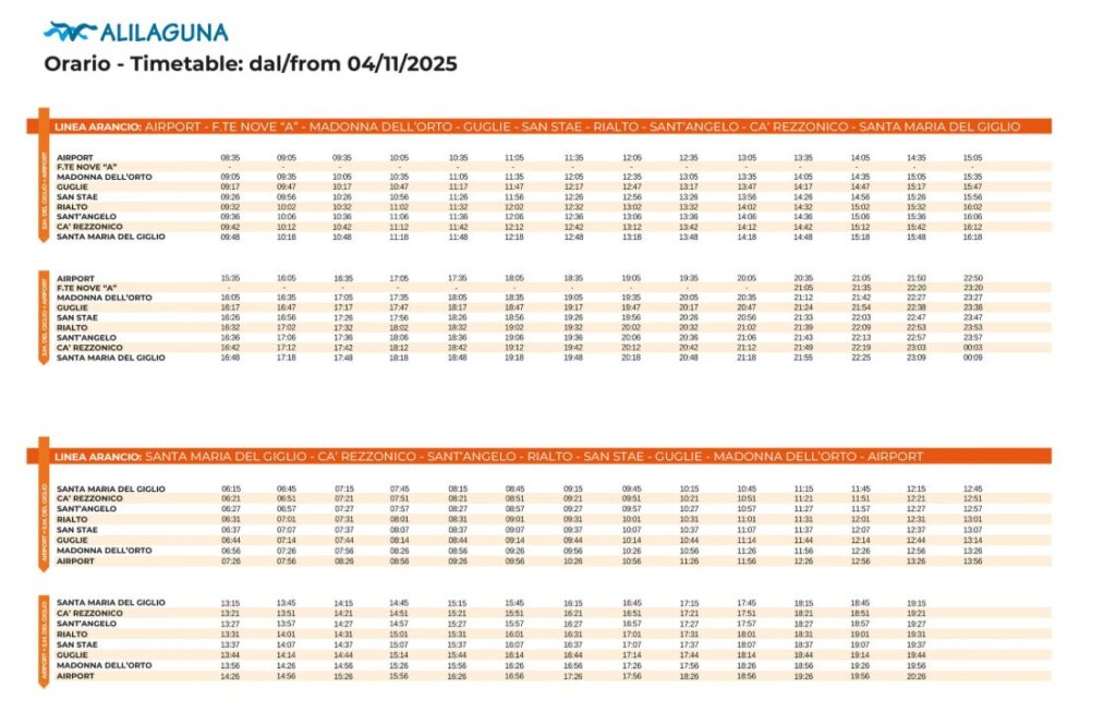 - Orange Linie (Linea Arancio): Ideal für Besucher des Canal Grande, da sie Haltestellen in der Nähe von Rialto und Ca‘ Rezzonico bietet.