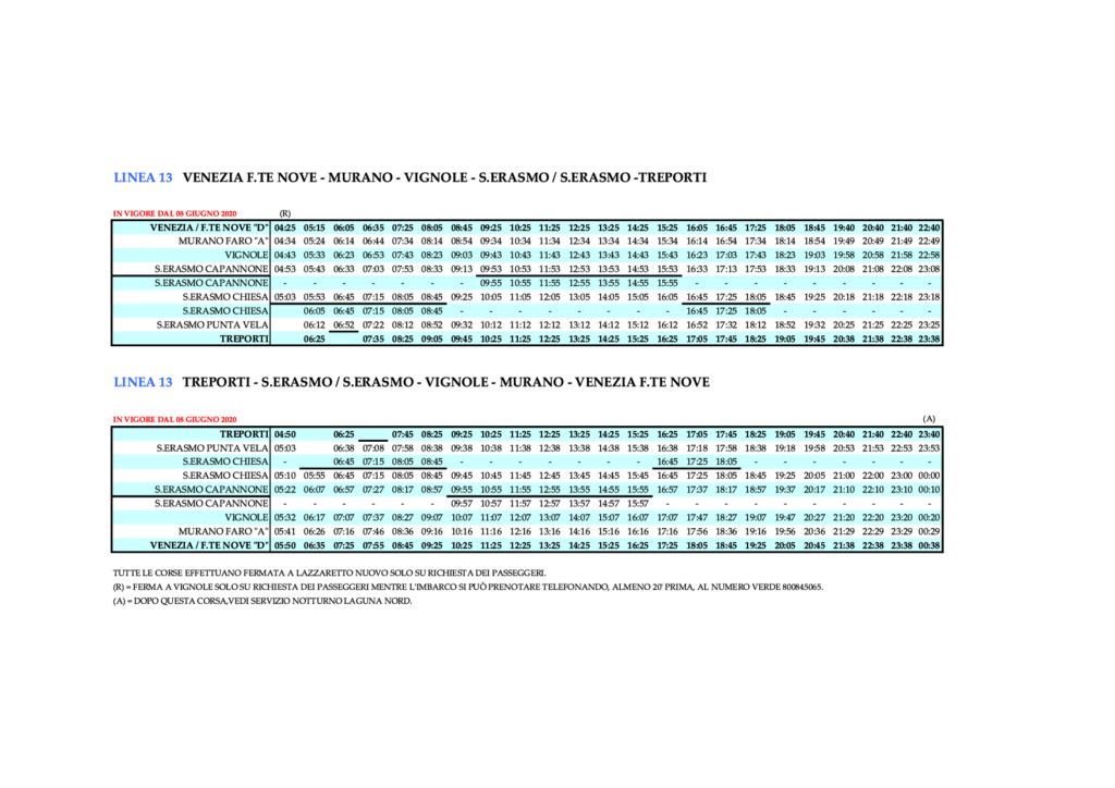- 3.16 Linie 13 – VENEZIA/F.TE NOVE – MURANO – VIGNOLE – S.ERASMO -TREPORTI und zurück