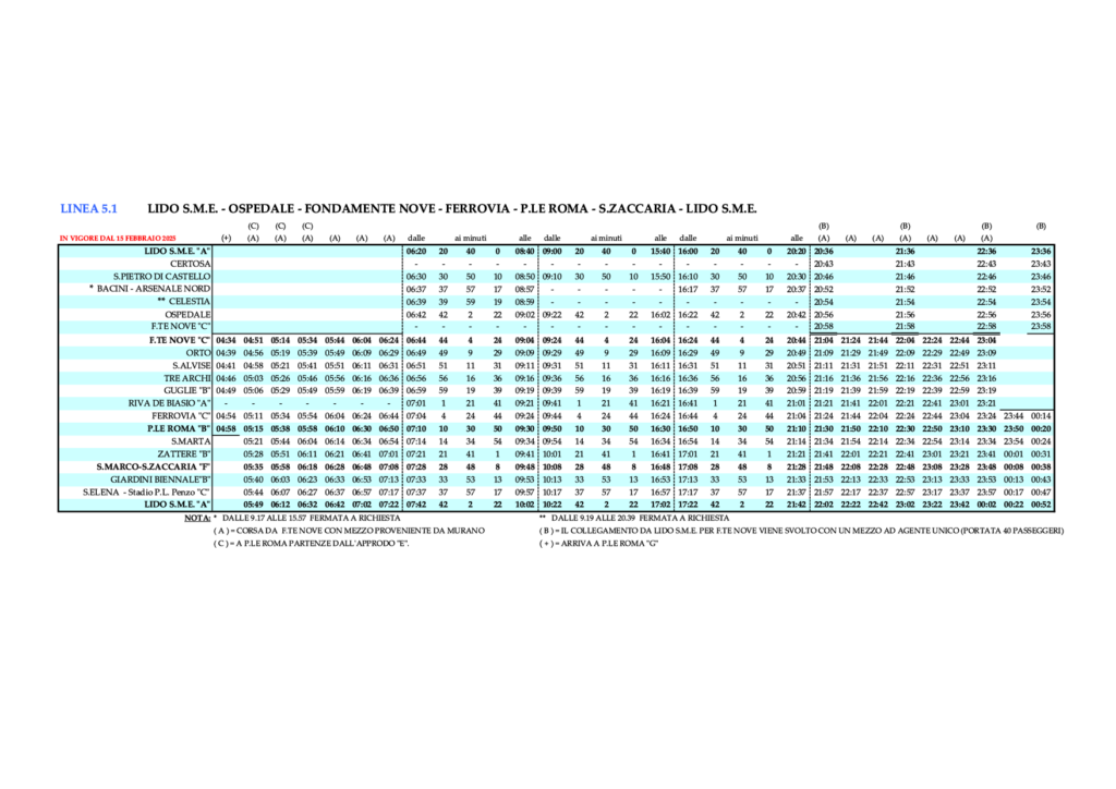 Linie 5.1 – LIDO S.M.E. – OSPEDALE – FONDAMENTE NOVE – FERROVIA – P.LE ROMA – S.MARCO/S.ZACCARIA – LIDO S.M.E.