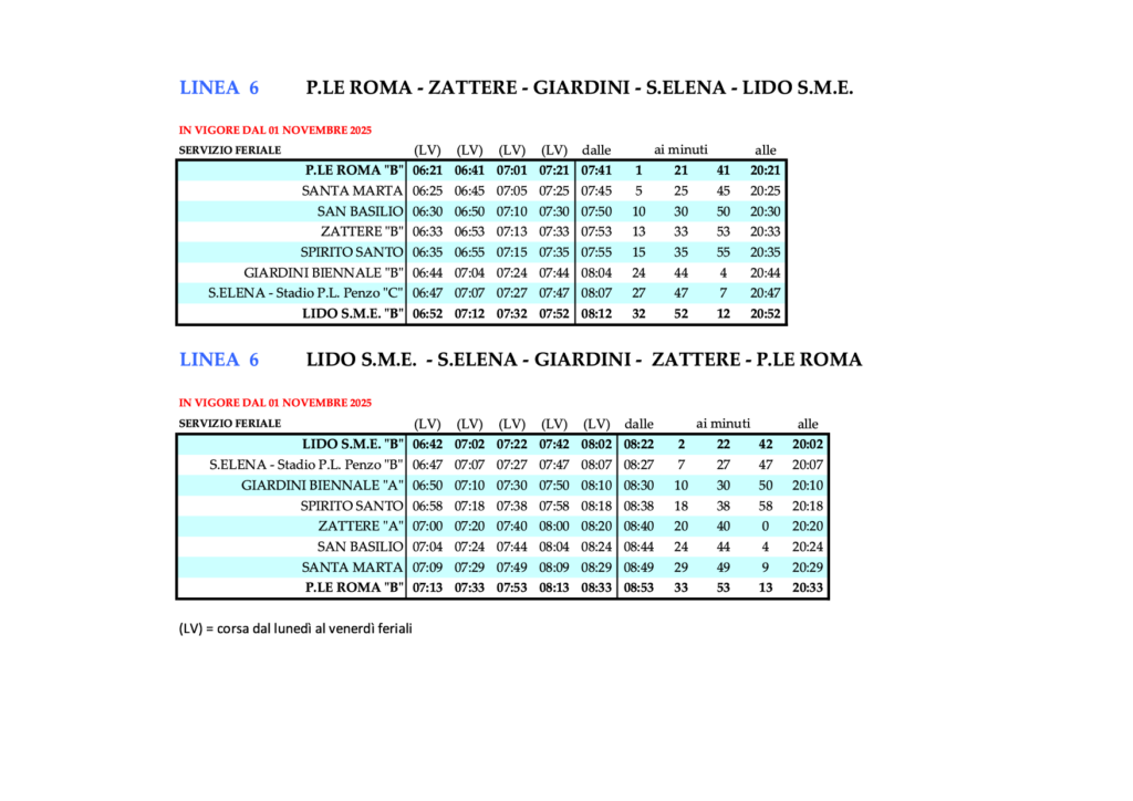 - 3.9 Linie 6 – P.LE ROMA – ZATTERE – GIARDINI BIENNALE – S.ELENA – LIDO S.M.E. und zurück