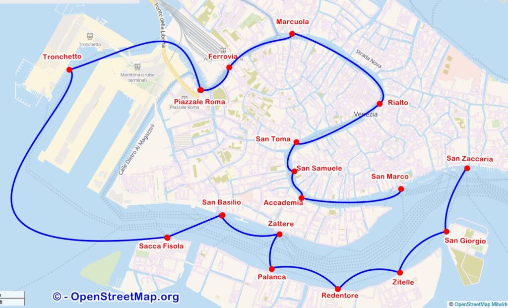 - 3.2 Linie 2 – SAN ZACCARIA / SAN MARCO – GIUDECCA – ZATTERE – TRONCHETTO – P.LE ROMA und umgekehrt